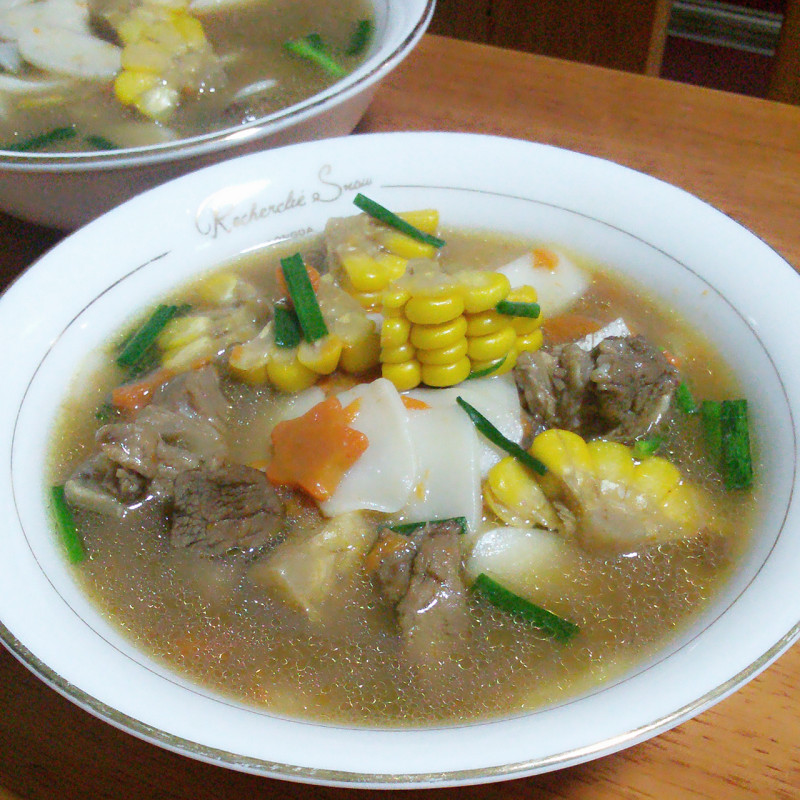 排骨150克;玉米适量;萝卜适量;葱姜适量;年糕2人份;