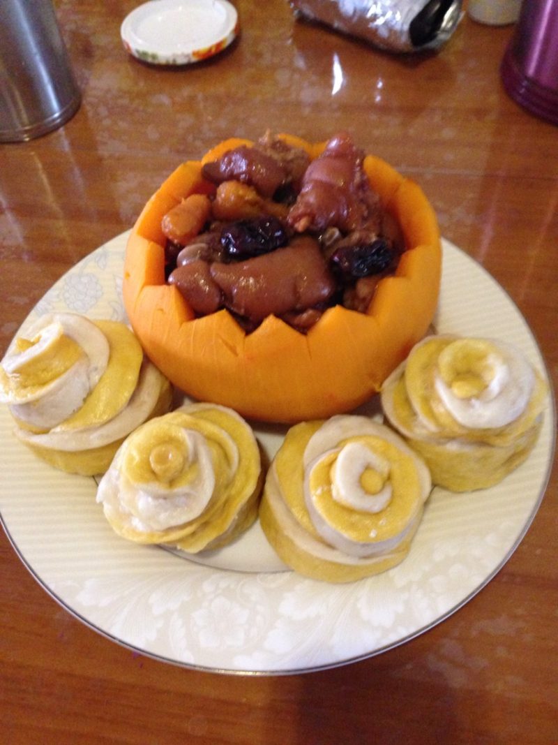 6:南瓜是蒸好的,多余的切成块放入南瓜里了。不成块的做成南瓜花卷了。