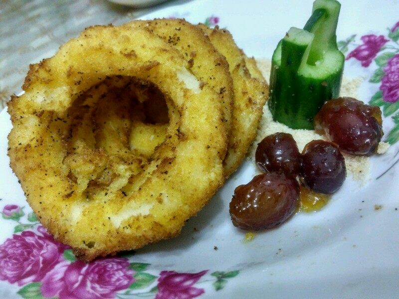 5:先把苹果圈裹上淀粉,然后裹上鸡蛋液,最后裹上面包糠,这个是我儿子裹的,我忘了拍照,就剩最后一个给孩子玩,才想起来,所以看起来不是很好看。。呵呵。