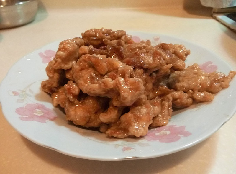 3:平底锅放入花生油,把腌制好的里脊肉倒进去炸到2面金黄,装盘,再倒入平底锅再复炸一次。