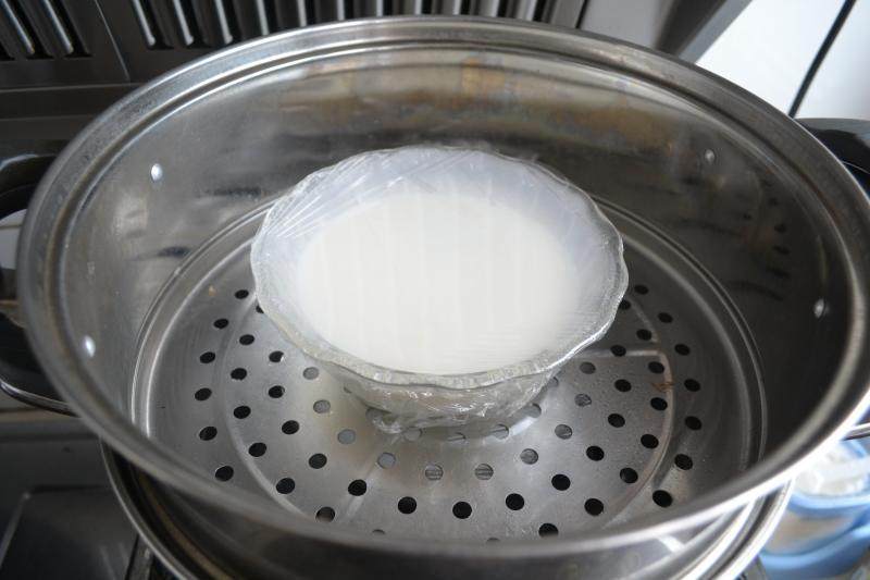 6:沿碗边儿倒回有奶皮的碗中,使奶皮浮起来,盖上保鲜膜冷水入锅,中小火蒸,加热约15-20分钟后,不要打开盖子,焖个5分钟再打开。