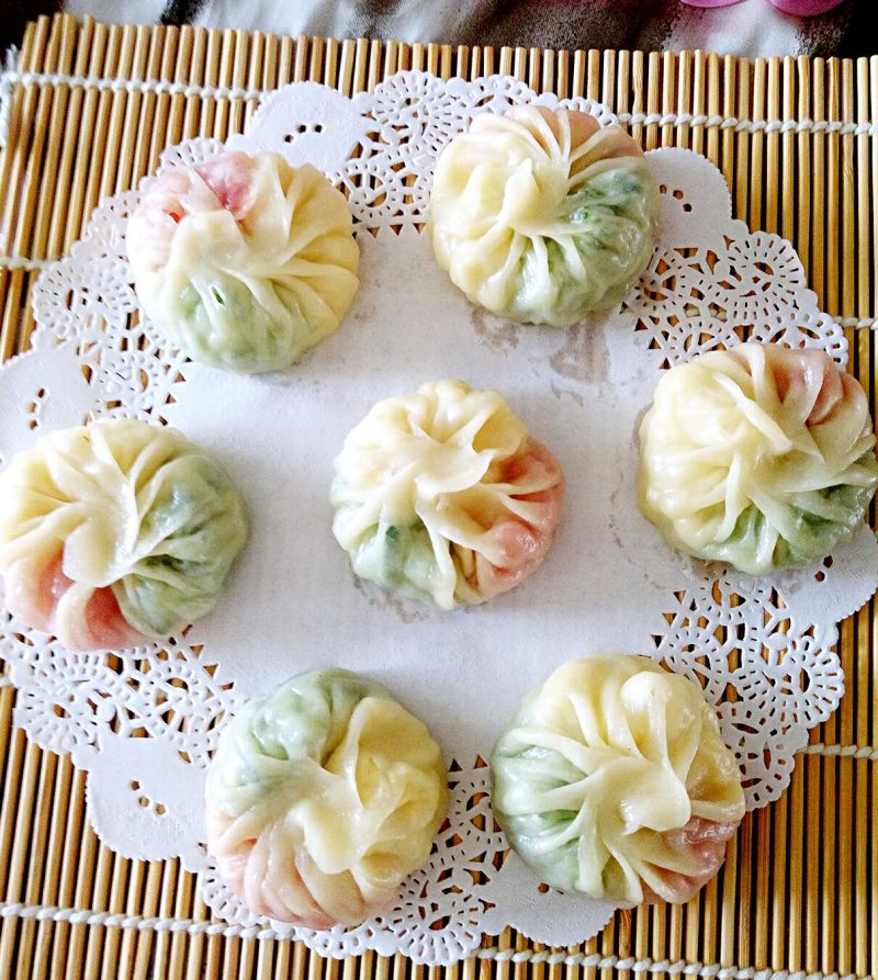 1.三种馅料一定要分区摆放,才能有效果。2.面皮一定要擀的薄薄的,这样蒸出来才能晶莹剔透。3.上火蒸三分钟足以,时间长了颜色变暗,口感也不好。