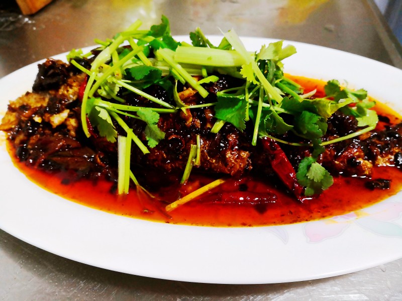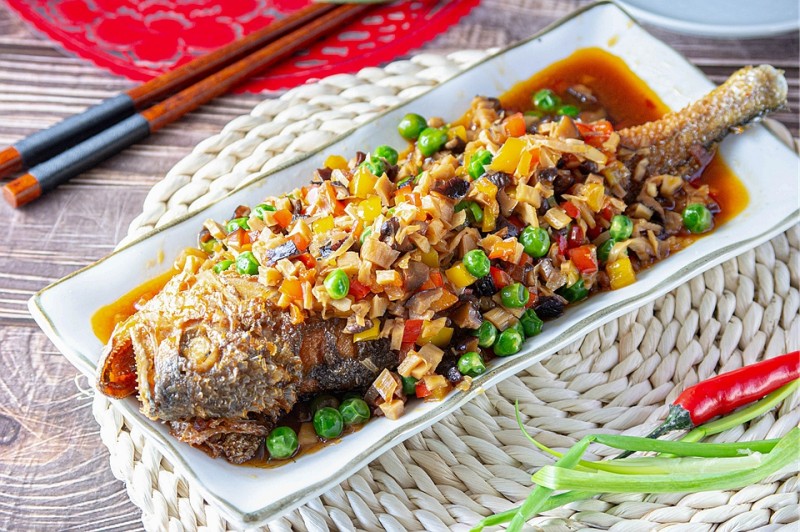 12:盛出后将各种配菜浇到鱼身上,撒上葱花即可。