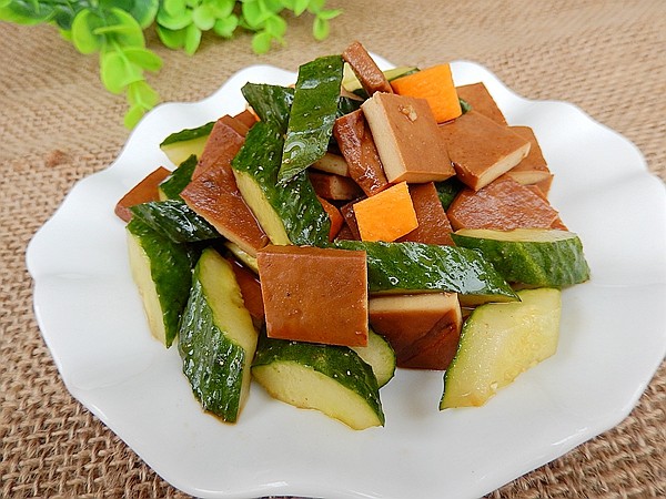 香干烧黄瓜是一道简单易做的家常菜。先将香干切片,黄瓜去皮切滚刀块。热锅下油,爆香蒜末后放入香干略煎,再加入黄瓜翻炒。调入生抽、蚝油和少许糖提鲜,加少量水焖煮几分钟,待黄瓜变软、汤汁收浓即可出锅。成菜咸鲜适口,香干有嚼劲,黄瓜软嫩,非常下饭。