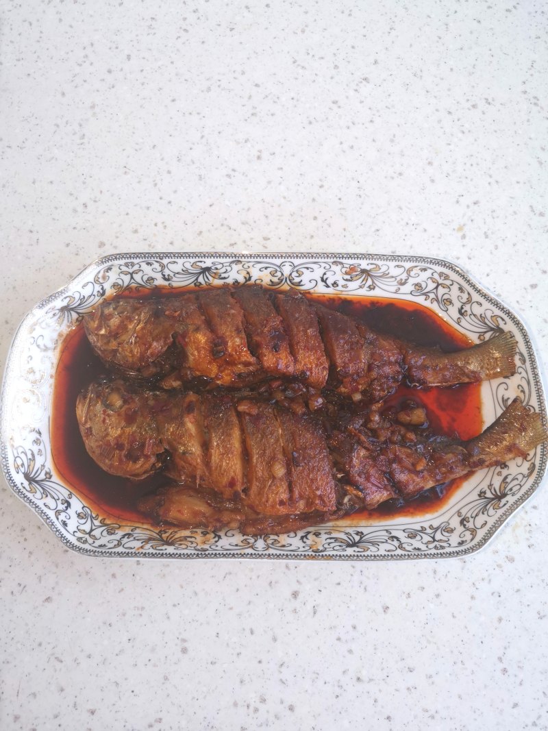 黄鱼500 克;香菇50 克;大蒜2 颗;大葱1 颗;小红椒1 颗;花椒20 粒;料酒4 茶匙;白糖1 茶匙;菜油1 汤匙;