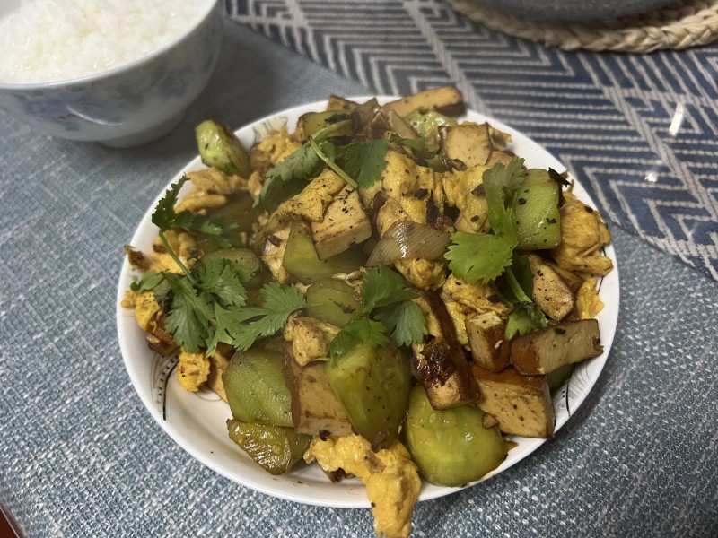 1:黄瓜滚刀,香干切片,鸡蛋打好,蒜和大葱切好,备菜完成。