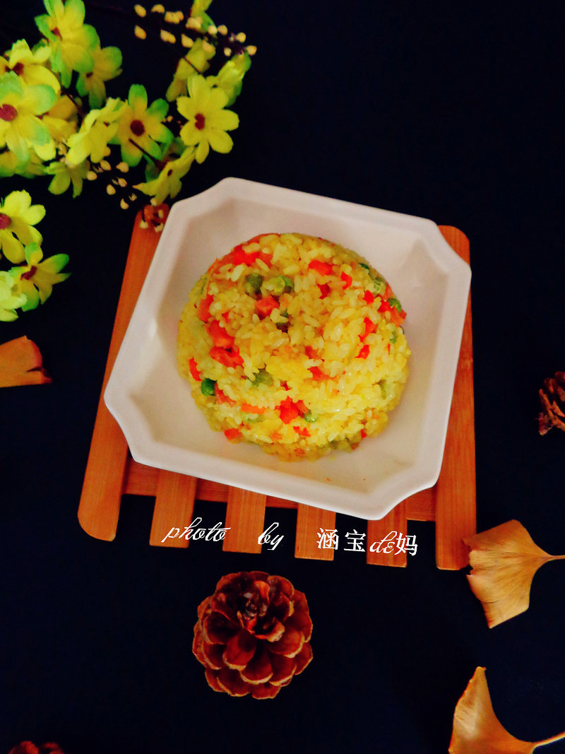 米饭1碗;火腿两片;胡萝卜半根;青豆适量;咖喱粉适量;盐适量;