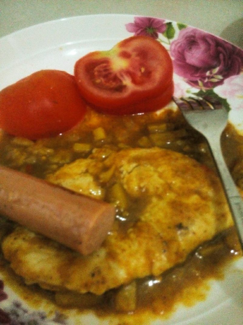 6:煎熟的鸡胸上盘,把薯仔咖哩汁倒到鸡胸上,加一条火腿肠和切番茄装饰和搭配营养!*^_^*