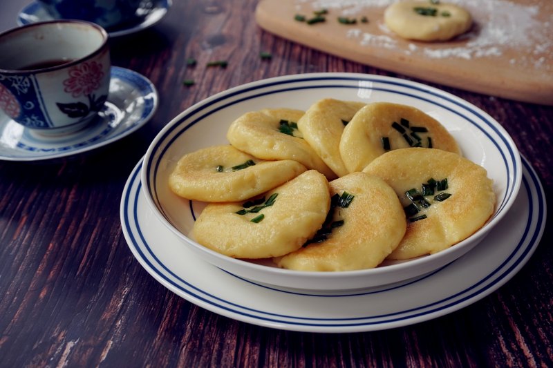 9:不粘锅里加油大火烧热,转小火,将土豆糯米饼一个个放入,先将没有葱花的那一面放入。