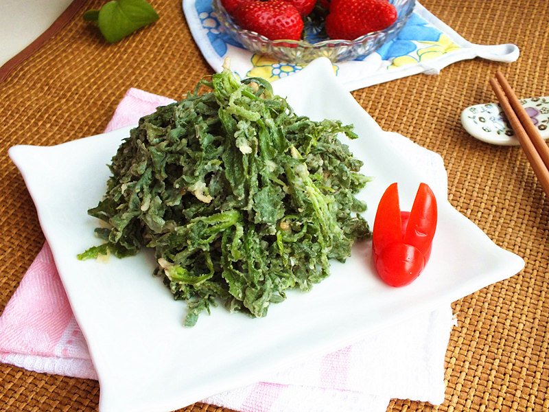 蒸菜时间不能过长、不能焖,否则菜叶就失去碧绿的颜色了,尽量不要铺太厚。面粉不要放太多,菜叶上裹薄薄一层就行。蒜泥要在不太热时放入,否则会变绿、有死蒜气。