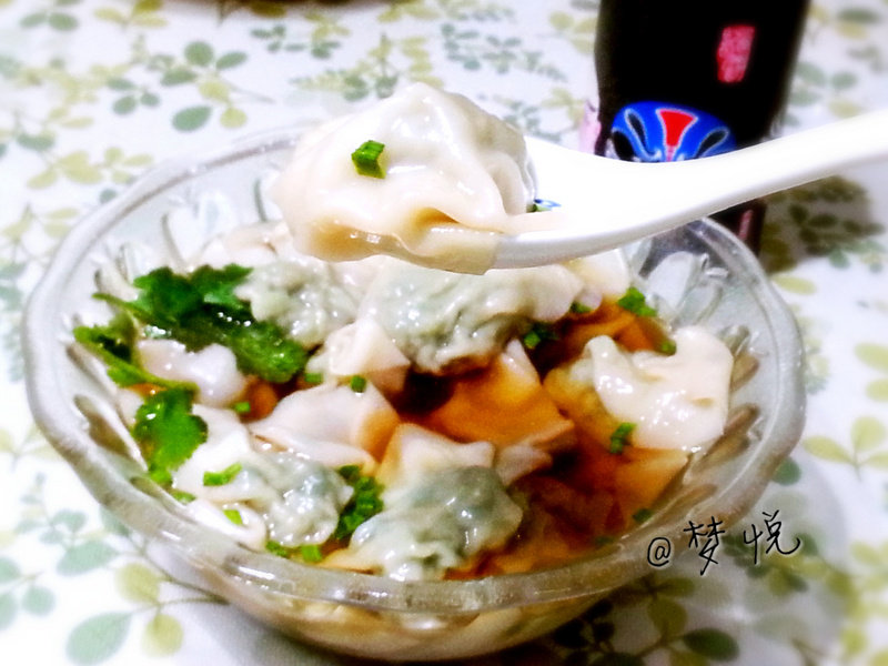 16:碗中用开水冲开调料,捞起馄饨装碗。洒少许香菜,淋几滴麻油。趁热食用。