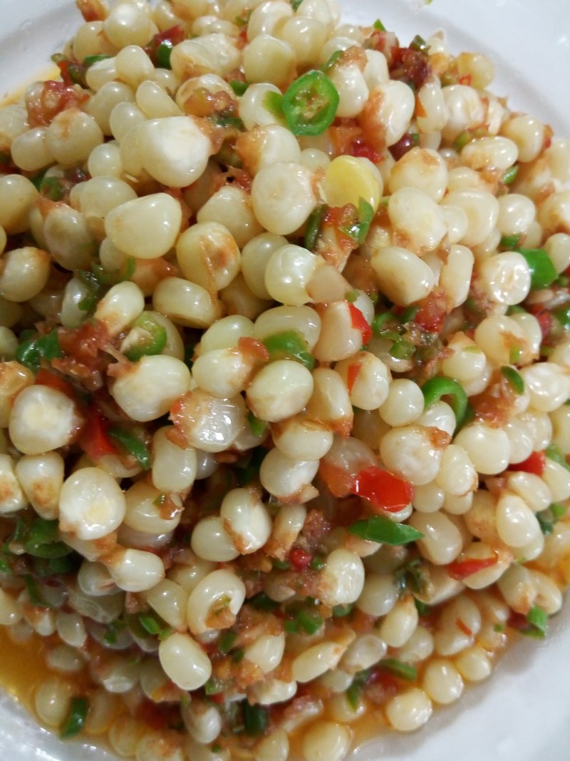 5:加玉米粒,盐,鸡粉翻炒均匀,玉米炒熟即可出锅。