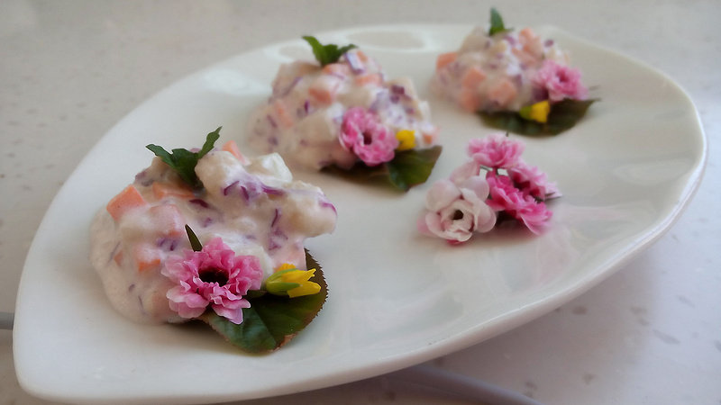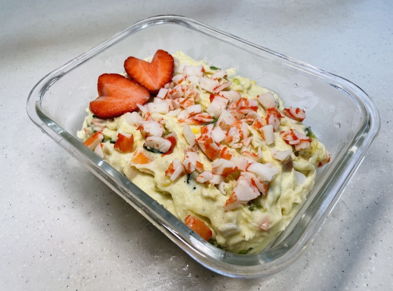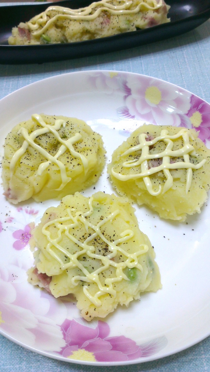 5:土豆泥拌入蛋黄酱,蛋白颗粒,火腿粒拌匀即可,可以稍微装饰一下。