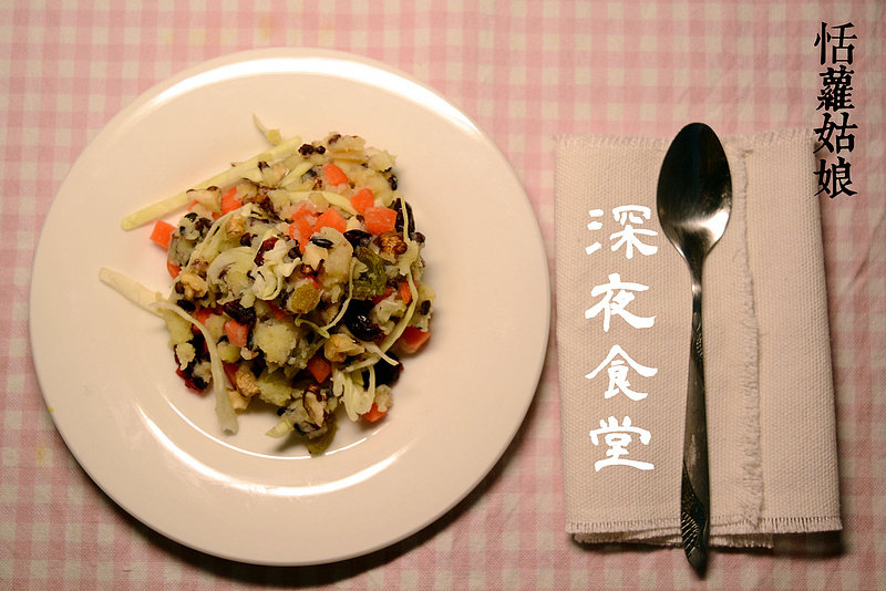 10:其余材料——包心菜、胡萝卜、蔓越莓干和葡萄干、核桃仁切碎