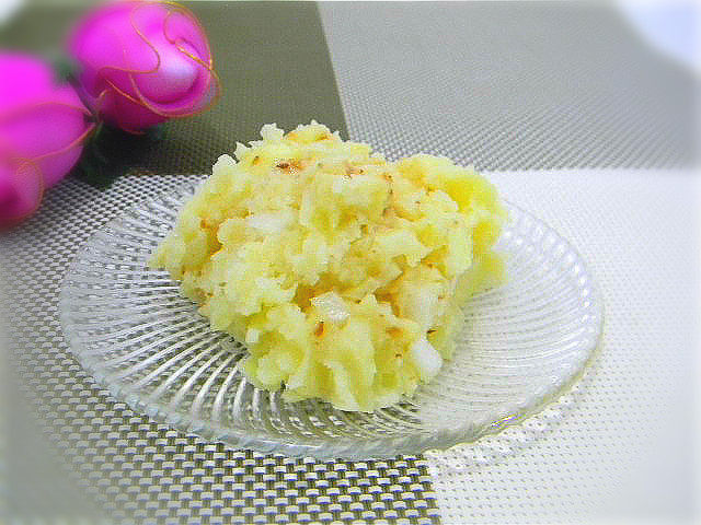 4:蒸熟的土豆泥趁热碾成泥。土豆泥中放入洋葱粒。