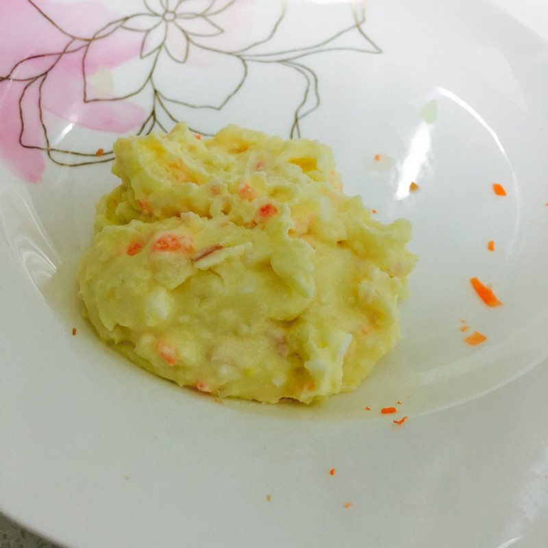 8:把刚刚胡萝卜碎,火腿碎,洋葱碎,蛋清一起放入土豆泥中并加入沙拉酱拌匀,可根据自己口味适量加入沙拉酱
