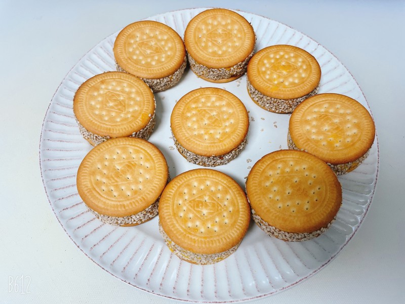 6:把做好的南瓜馅料团成圆柱体,用两块饼干夹上,把南瓜派在白芝麻碗里滚一圈裹上白芝麻。