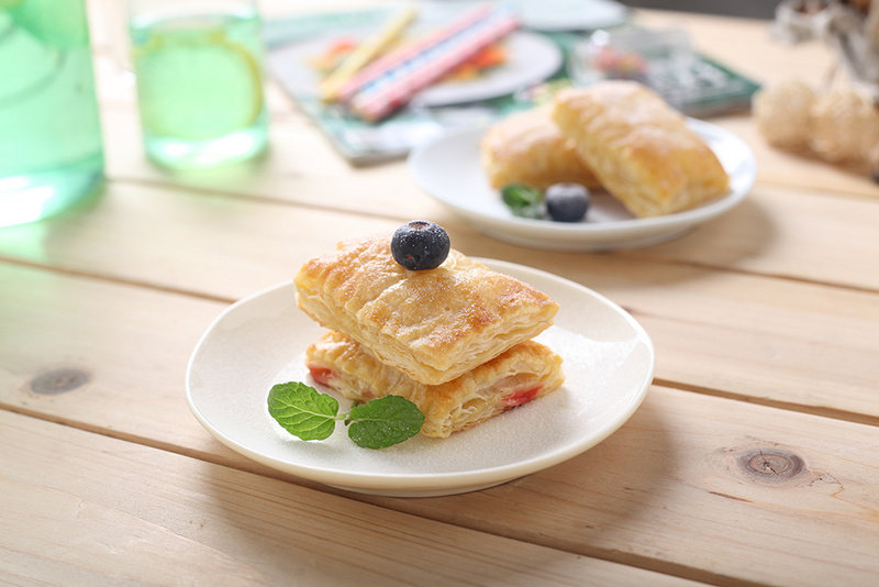 24:千层酥皮根据派模具的大小,截取成比派模具稍大的小片。