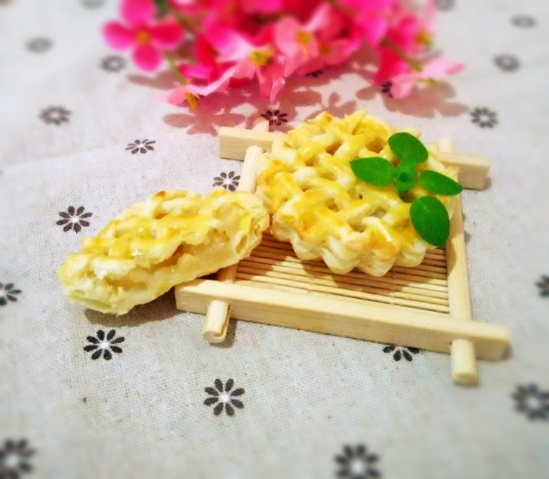 31:千层酥皮做成的条状面片,搭在派上,开始编制,像花篮一样,一上一下,就可以了。