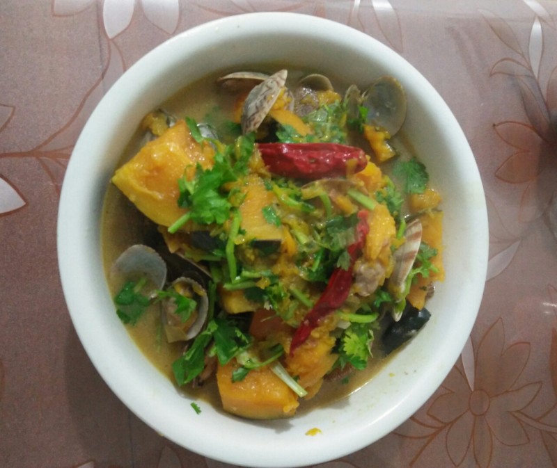 4:加水2倍倭瓜,已莫过为好.加盐,十三香盖锅盖开始大火炖开后中火炖,中途看快熟时搅拌一下,然后加麻蚶子,在继续炖。