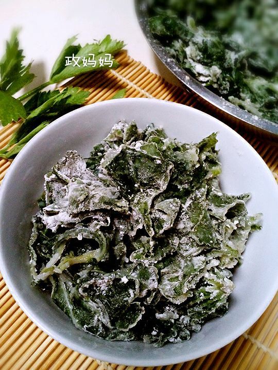撒面粉的时候使地瓜叶均匀的裹上薄薄的一层即可。蒸熟后蘸着蒜泥或别的酱汁吃。