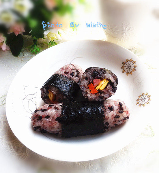 圆粒糯米半碗;血糯米适量;鸡蛋1个;胡萝卜适量;香肠1根;肉松适量;海苔4片;