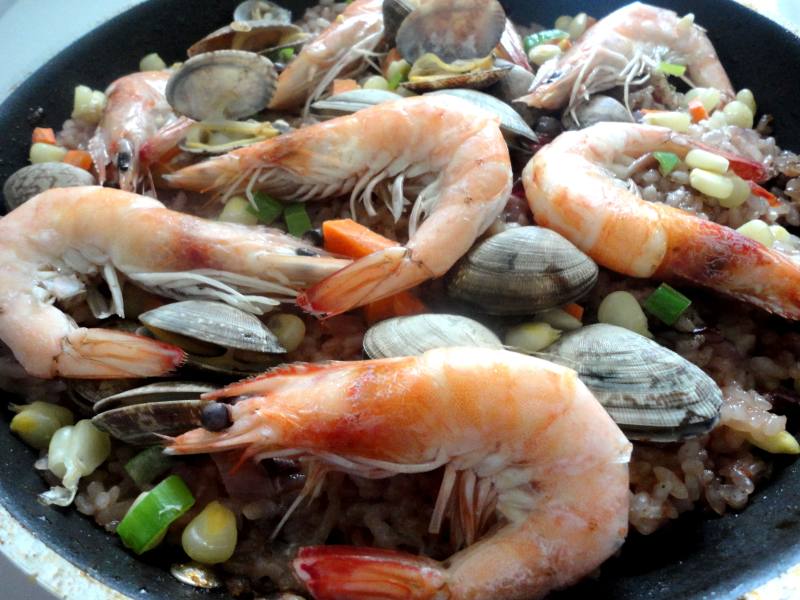 10:加入大虾和花贝,还有玉米粒和胡萝卜粒,再焖10分钟
