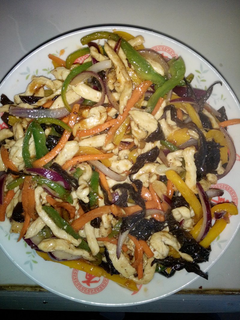 彩椒适量;木耳适量;胡萝卜适量;洋葱适量;油根据个人口味定量;蒜姜少许;淀粉少许;生抽适量;鸡精适量;盐适量;料酒适量;十三香适量;