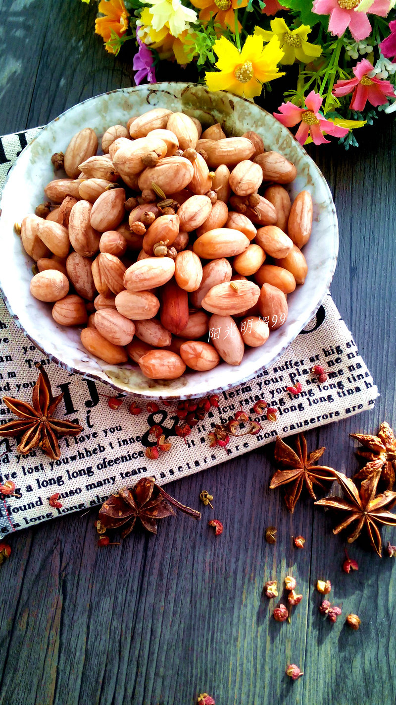 1:花生米淘洗干净后,用凉水泡上,放入花椒,小茴香,八角,搅拌几下。