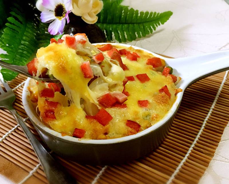 1:材料集合。火腿粒是后来加入的,所以没有拍进去。