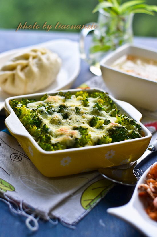 9:取烤碗,先铺上土豆泥,再铺上西兰花,最后放上芝士。