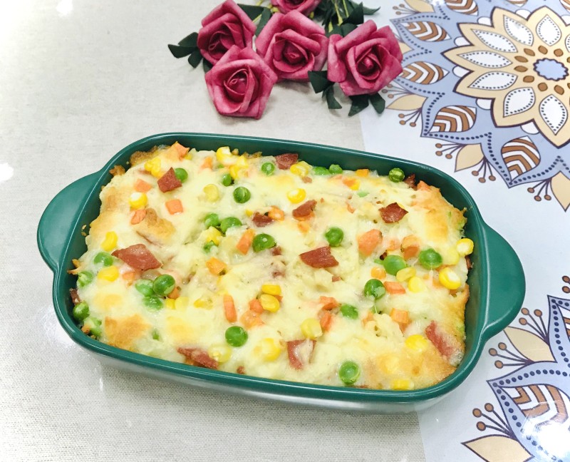 13:烤至马苏均匀包裹土豆泥,颜色金黄即可。