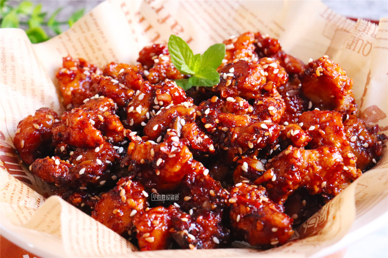 5:翻炒酱汁至粘稠时加入炸好的鸡块,快速翻炒使鸡块均匀的裹上酱汁,即可出锅摆盘。