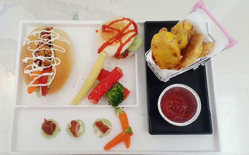 4:蟹柳和地瓜加入生粉盐,入锅炸熟捞起。装入小推车装饰。