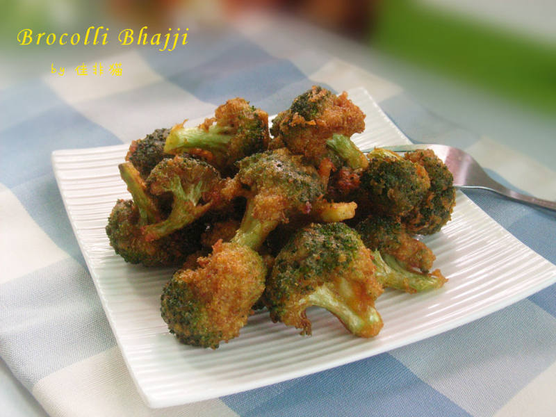 5:锅中加油烧热,入裹满面糊的西兰花,先大火稍炸一会儿,再转小火炸至金黄;