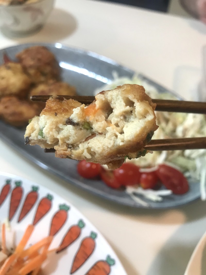 15:豆腐丸子炸完一遍后,沥出。稍稍冷却后,再放入油锅里炸第二遍。(天妇罗也是需要炸第二遍才会酥脆,否则就软软的。)