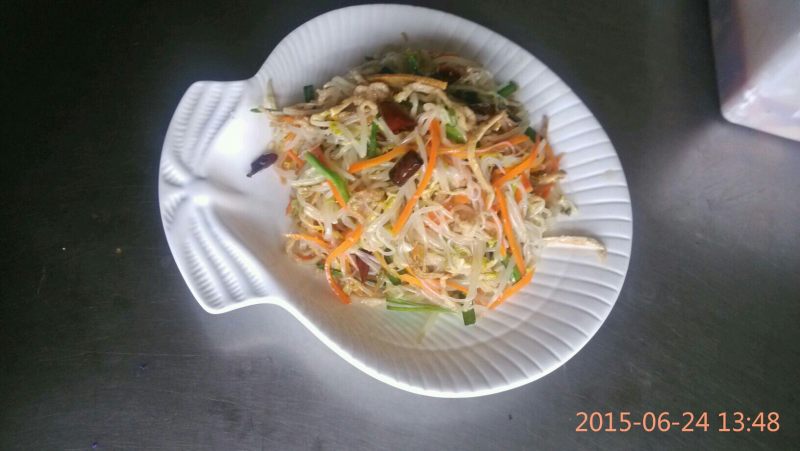 1:豆芽:过水投凉备用。粉丝:过水投凉备用。豆腐:切片过油至微干切条备用。胡罗卜:切丝过水投凉备用。韭菜:切段备用。肉:切丝腌制过油备用。