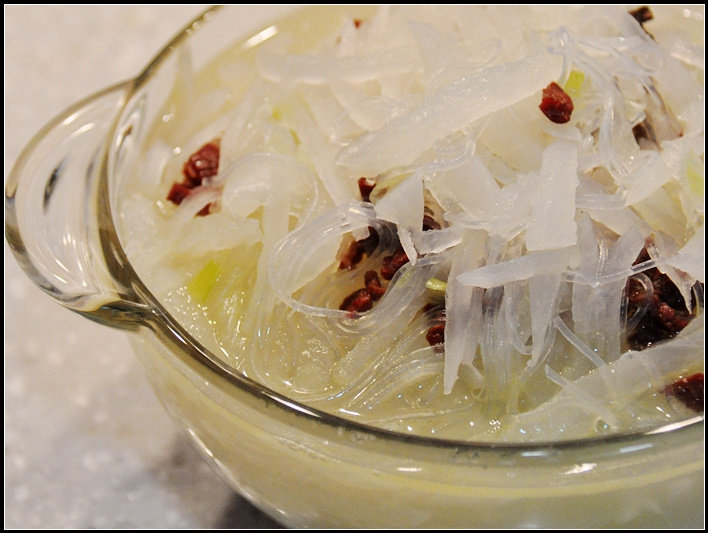 一定要用新鲜的卤水豆腐,不然汤不变白,味道也不好。牛肉也要嫩牛肉,不然半天也煮不熟。今天做的突然,家里没苏子了就沒做延边这里喝牛肉汤专门用的辣酱,只能用辣椒油了。