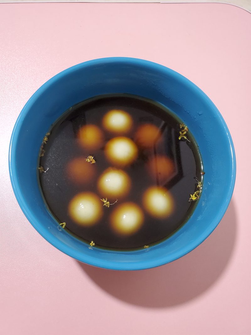 7:放入红糖桂花甜汤中,再放一丁点桂花点缀下