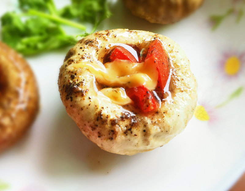 2:将培根和蔬菜粒装进蘑菇口中,并撒上少许黑胡椒粉。