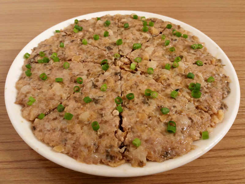 做这肉饼不用话盐。梅菜的盐份已经够的。
