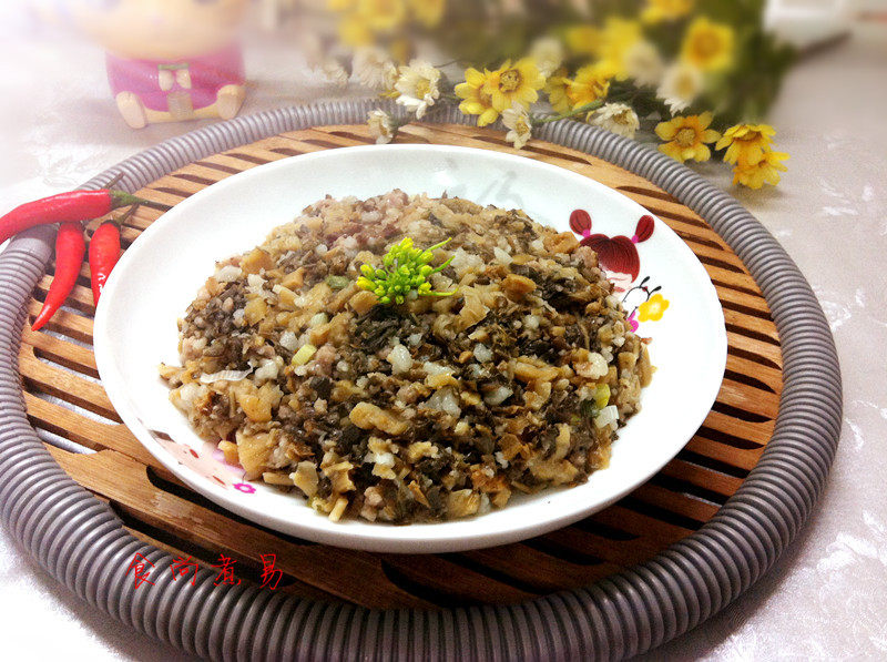 3:梅干菜提前泡好,清洗干净,切碎(切的越细越好,有时间的话先蒸下)