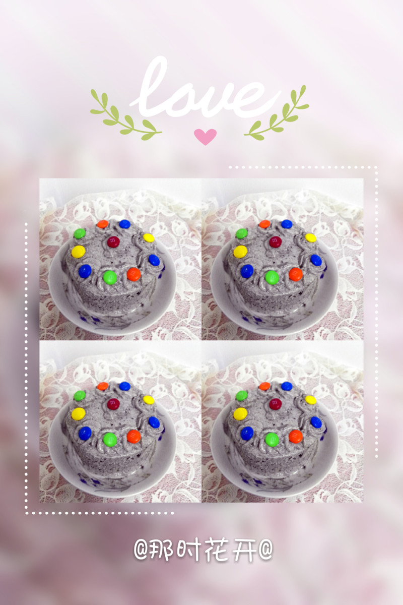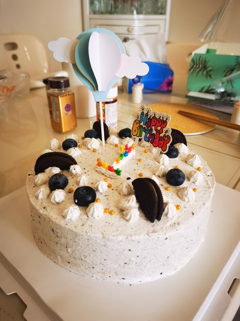 3:挤花,放蓝莓,放奥利奥饼干装饰。放上糖珠继续装饰。