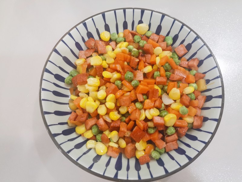 1:豌豆、玉米剥粒,火腿肠、胡萝卜切丁,葱、蒜切碎。