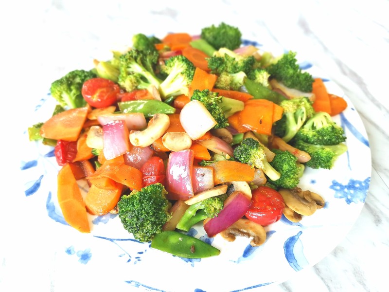 西兰花1小棵;洋葱半个;胡萝卜1根;白蘑菇5个;圣女果5个;荷兰豆1小把;火麻油10克;