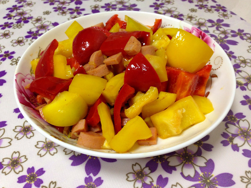 火腿片8片;红彩椒半个;黄彩椒半个;绿辣椒一个;
