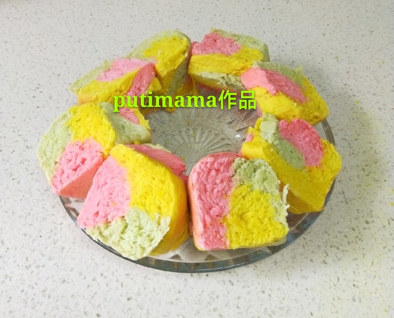 4:把三张擀好的面片按照自己喜欢的色彩搭配方式摞在一起。
