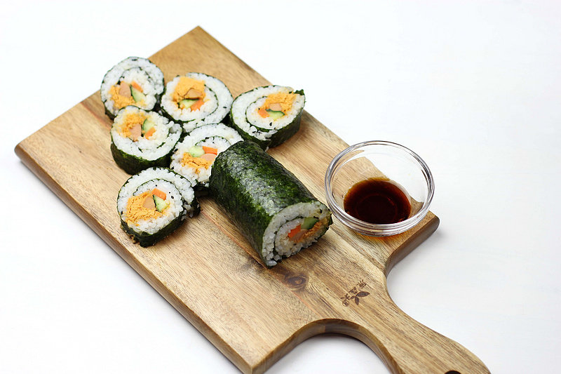 1.在往海苔上放米饭时,收口处米饭要略少,以便于成型。2.卷寿司时力量要均匀。3.切寿司时刀要沾水。