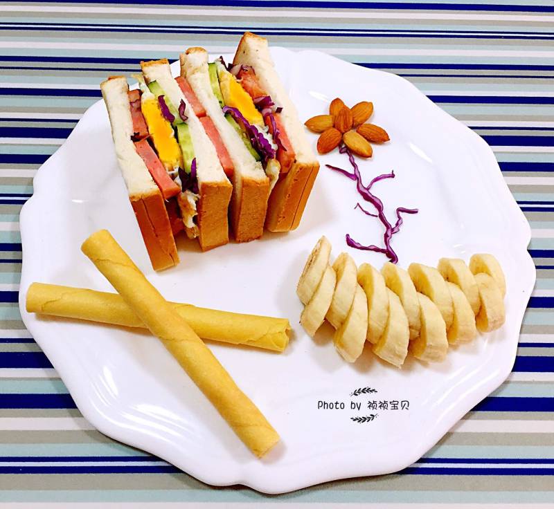 9:土司三明治摆入盘中杏仁摆出花朵形状紫甘蓝做花茎香蕉做根蒂