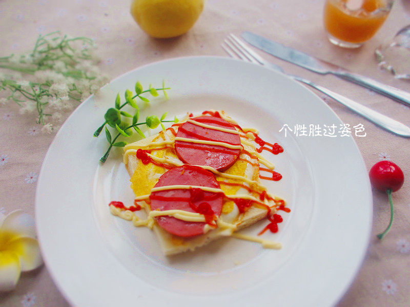 7:盖上另一片土司片就可以。可以对角线切开,配上一杯牛奶,享受吧。